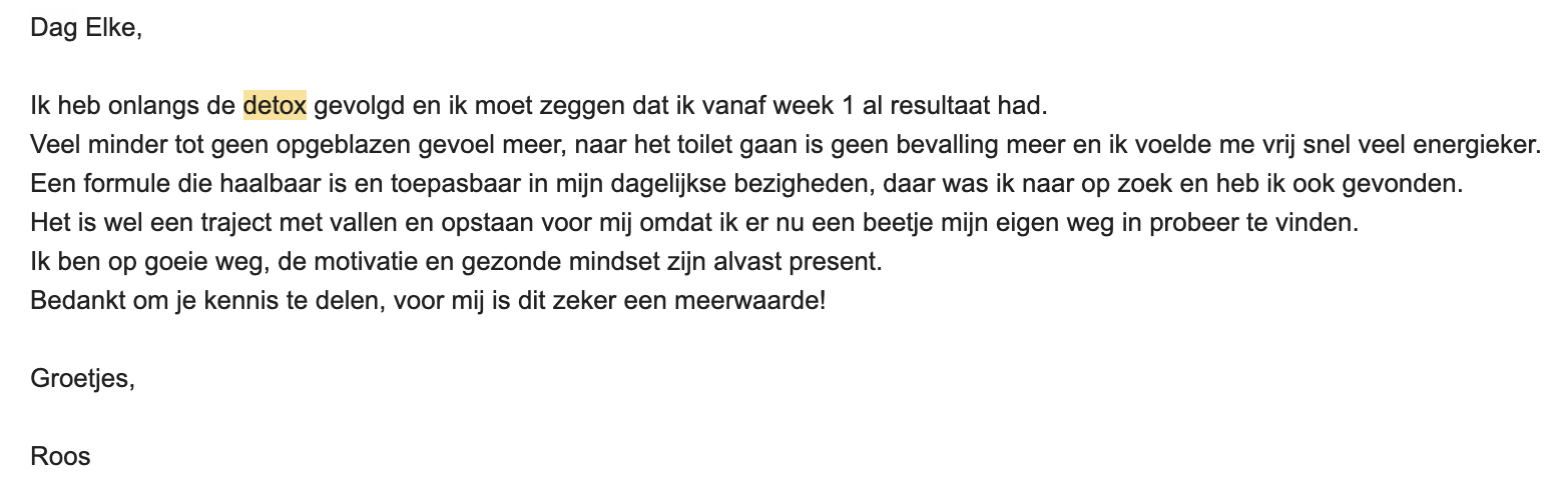 Na vier detox weken merkte ik duidelijke verbetering. Mijn stoelgang ging van 5 à 6 keer per dag heel slap naar drie keer bijna normaal. Voor mij weer leefbaar. De aanpak van Elke voelde logisch en haalbaar, en ik ga hier rustig mee verder.