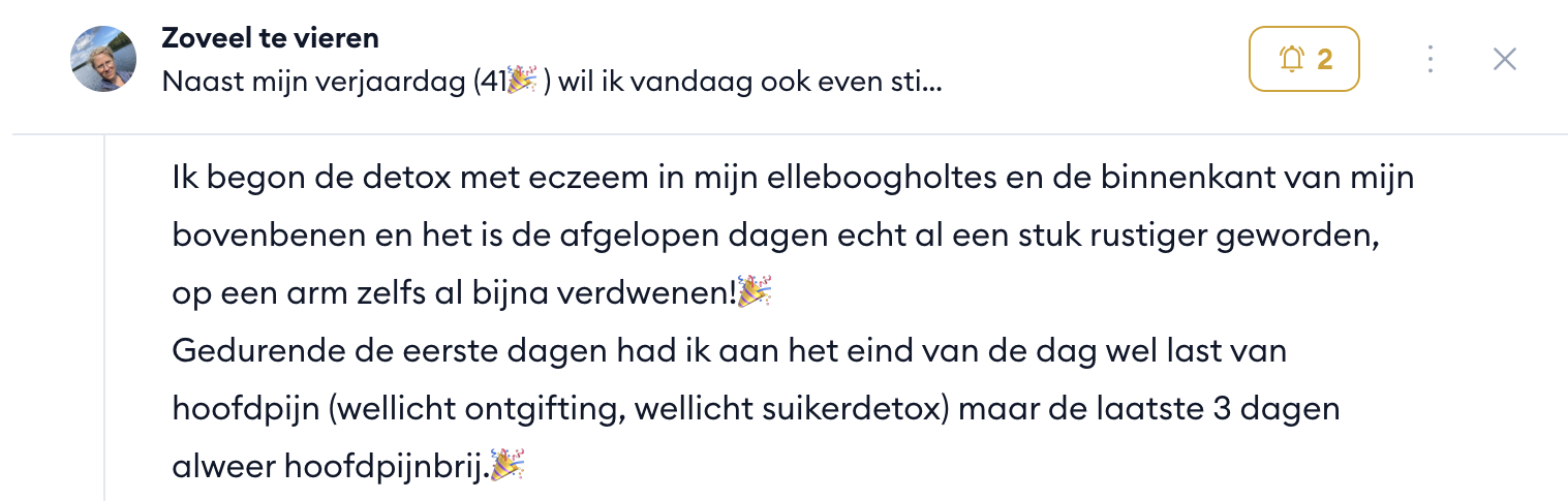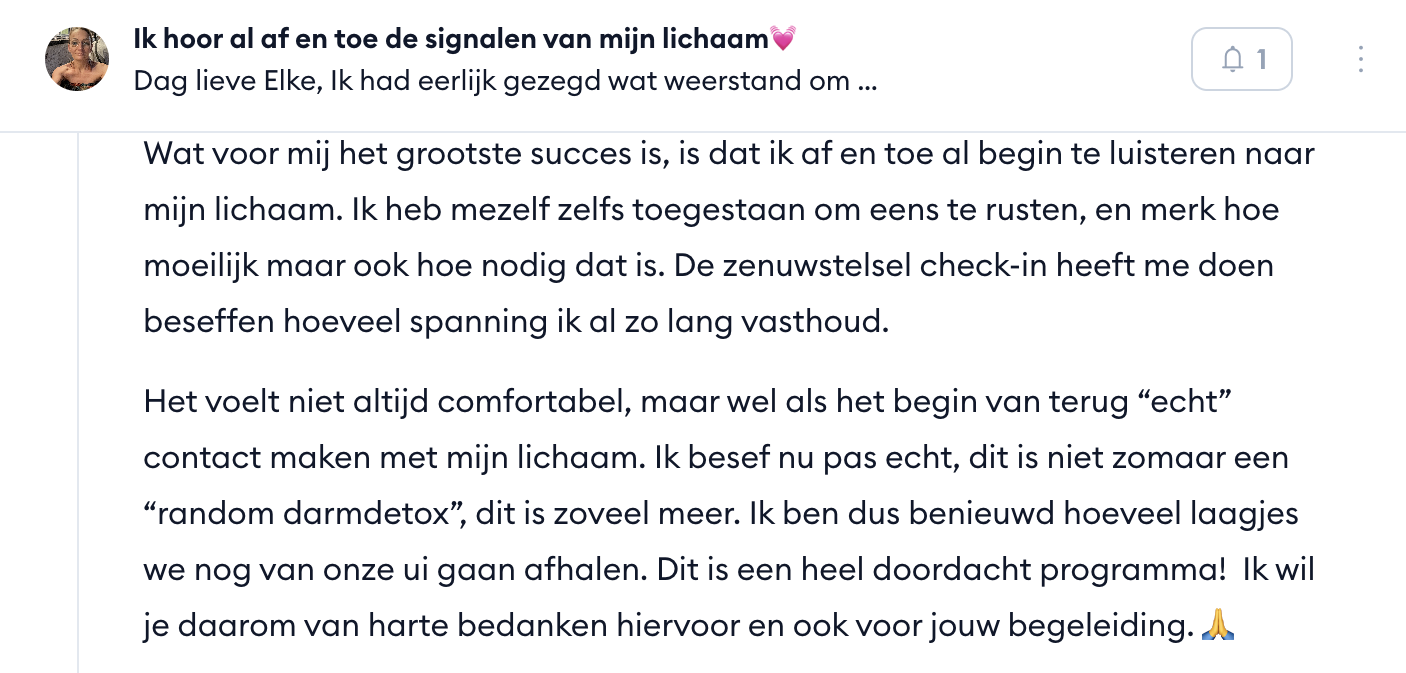 In de online community kan je je vragen stellen en ervaringen delen. Ik begeleid je hier persoonlijk als darmexpert, zodat je bij twijfel of onzekerheid snel kan bijsturen.
